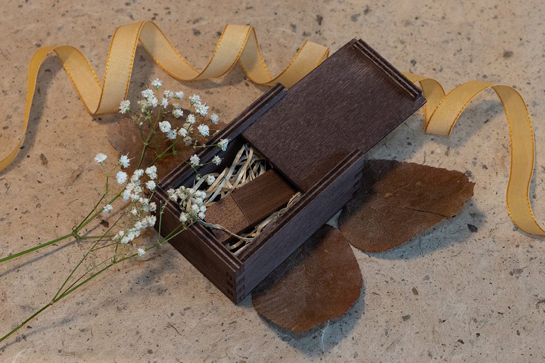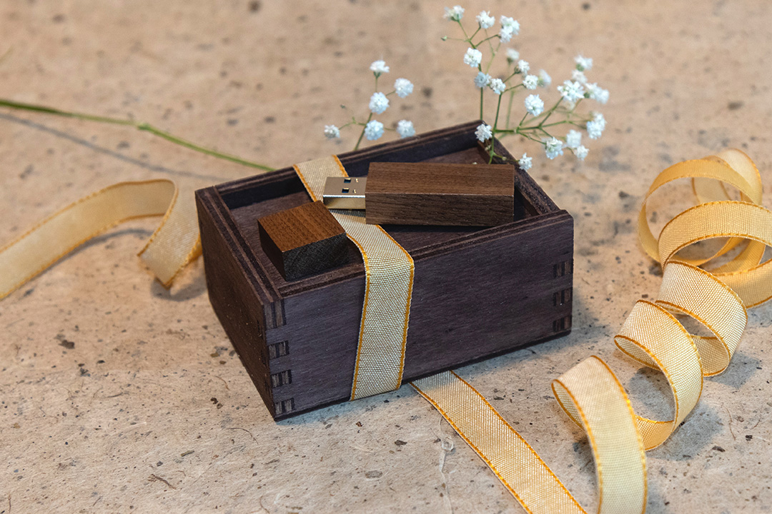 Confezione artigianale in legno per chiavette USB, realizzata con coperchio scorrevole. Personalizzabile con incisione del logo.
